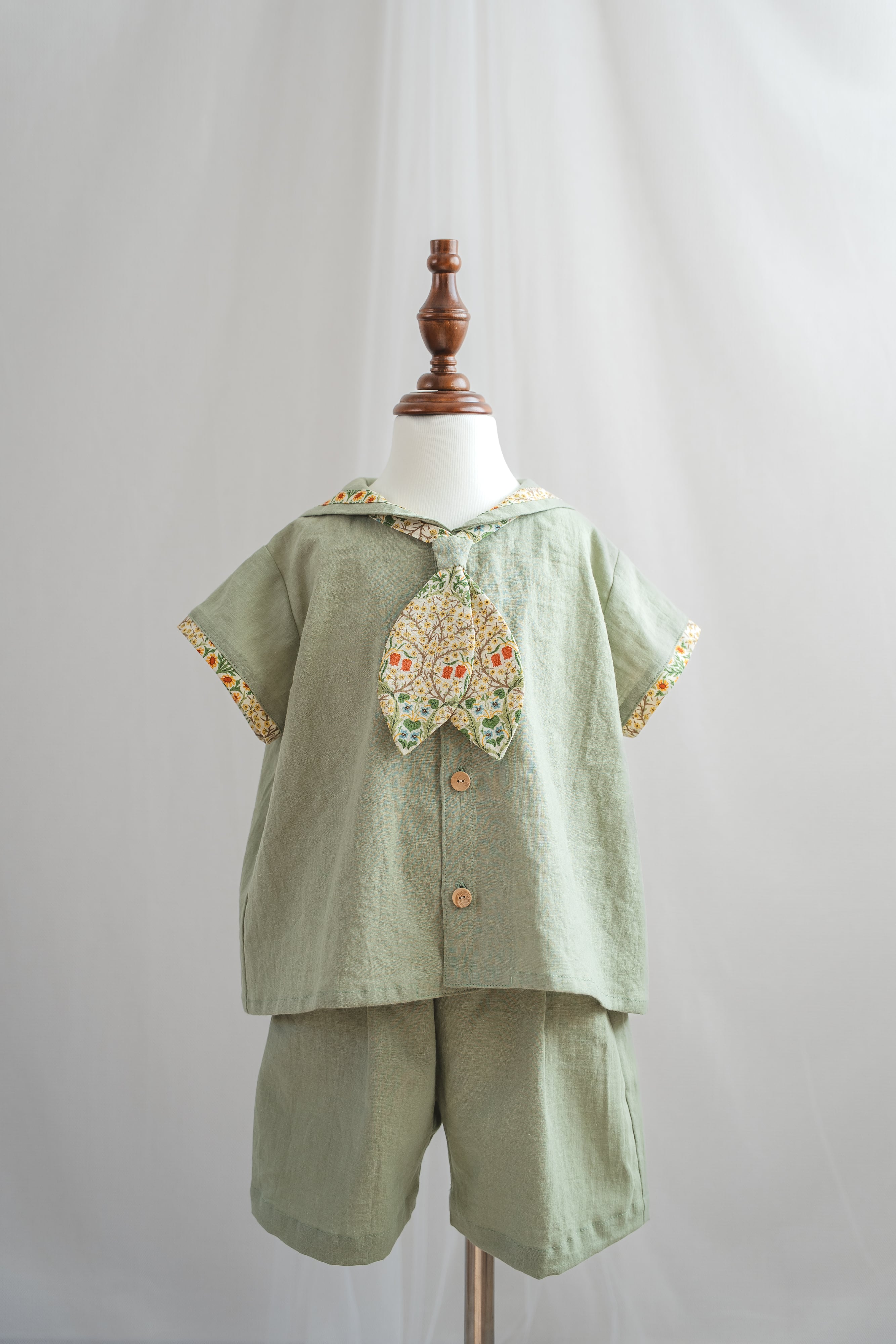 夏に着たい、王道のセーラーカラーのポイントとなるように、Morris/Libertyの美しい柄をセレクトしました。男の子でも可愛い花柄を選びたい、男女で違和感なくお揃いがしたい、シンプルなデザインが好き、そんな方に選んでいただきたい1着です。