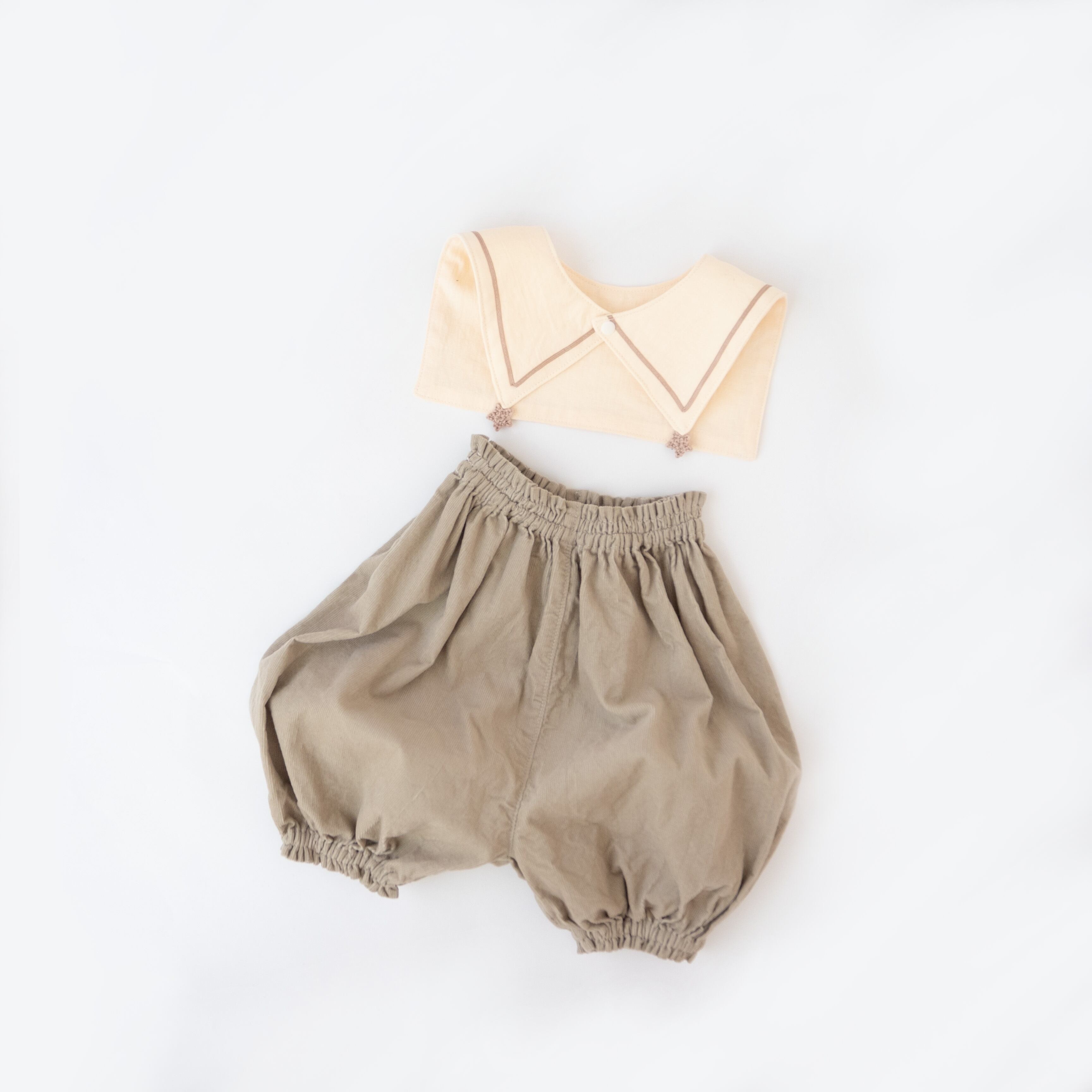 女の子の付け襟はよく見るものの、男の子の付け襟はあまりみないな…とふと気づき、男の子でもおしゃれな首元になるようなデザインに仕立てました。もちろん、男女どちらでもご着用いただけます。